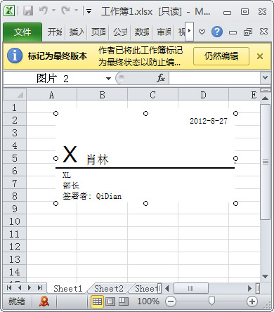 步驟四、Excel窗口左下角的狀態(tài)欄中將顯示“此文檔包含簽名”標(biāo)記,表示該文檔已被簽名,此時(shí)工作簿以“標(biāo)記為最終版本”的只讀方式顯示,如圖所示。功能區(qū)與快速訪問工具欄中的大多數(shù)按鈕將呈不能使用的灰色狀態(tài),達(dá)到了保護(hù)文檔的目的。
