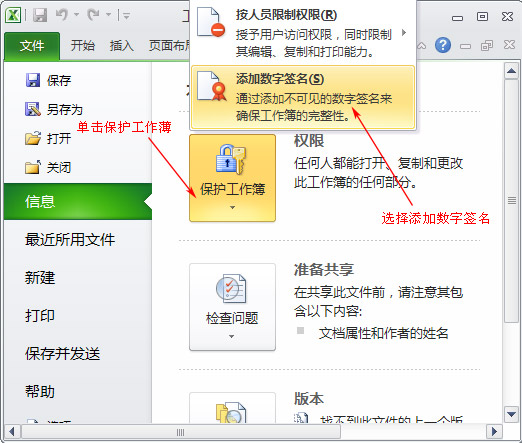 步驟一、在“文件”選項(xiàng)卡中單擊“信息”選項(xiàng)卡,在其界面中單擊“保護(hù)工作簿”按鈕,在彈出的下拉菜單中選擇“添加數(shù)字簽名”命令,如圖所示,此時(shí)會彈出提示對話框,單擊“確定”按鈕。