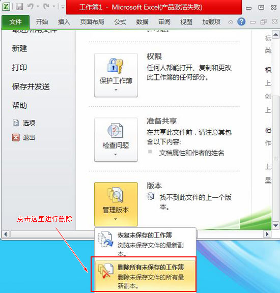 如果未保存的工作簿都不是用戶所需要的文件,為了減輕電腦的存儲負擔(dān),可將這些文件刪除,其操作為在“文件”選項卡中單擊“信息”選項卡,在其界面中單擊“管理版本”按鈕,在彈出的下拉菜單中選擇“刪除所有未保存的工作簿”命令,在打開的提示對活框中單擊“是”按鈕,即將所有未保存的工作簿刪除,如圖所示: