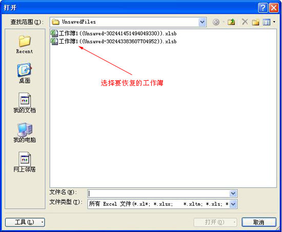打開“打開”對話框,在中間的列表框中選擇需要恢復(fù)的工作簿,單擊“打開”按鈕即可,如圖所示: