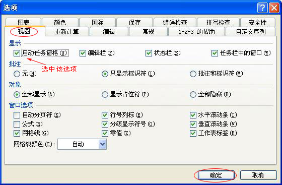 打開“選項”對話框,單擊“視圖”選項卡,在其中的“顯示”欄中選中“啟動任務(wù)窗格”復選框,單擊“確定”按鈕,完成啟動時顯示任務(wù)欄的設(shè)置,如圖所示: