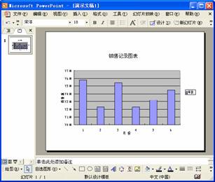 要將Excel中的圖表復制到PowerPoint中,首先要選中源文件中要復制的圖表,并對其進行復制。然后切換到PowerPoint窗口中,單擊“粘貼”按鈕,Excel中的圖表就被粘貼到了PowerPoint中。單擊PowerPoint中的圖表,對其大小和位置進行調整后,其結果如圖所示