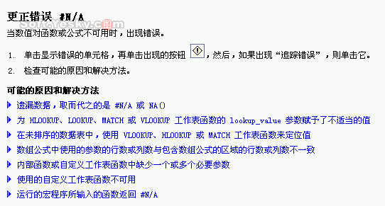 說明二:出現(xiàn)“#N/A”錯(cuò)誤的原因還有其他一些,選中出現(xiàn)錯(cuò)誤值的B10單元格后,會(huì)出現(xiàn)一個(gè)智能標(biāo)記,單擊這個(gè)標(biāo)記,在彈出的菜單中選擇“關(guān)于此錯(cuò)誤的幫助”(如圖6),就會(huì)得到這個(gè)錯(cuò)誤的詳細(xì)分析(如圖7),通過這些原因和解決方法建議,我們就可以逐步去修正錯(cuò)誤,這對其他的錯(cuò)誤也適用。