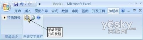 安裝ExcelPrinter后,再打開Excel2007切換到“加載項”選項,你會發現比原來多出了“手動雙面打印”和“打印當前頁”這兩項工具按鈕(圖2)。單擊“手動雙面打印” ,效果就和Word中的雙面打印一樣,會在打印完單頁內容后彈對話框提醒你換一面,確定后再打印出雙頁內容。