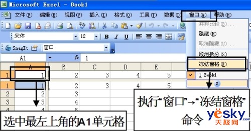 第二步:單擊選中最左上角的“A1”單元格,執行“窗口”→“凍結窗格”命令(如圖3)。