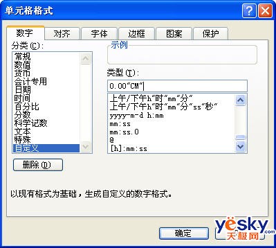 第二步:在打開的“單元格格式”對話框中,在“數字”標簽中,選中“自定義”項,在右側“類型(T):”下方的文本框中輸入“0.00"CM"”(如圖2,不含外側引號),最后單擊“確定”按鈕。