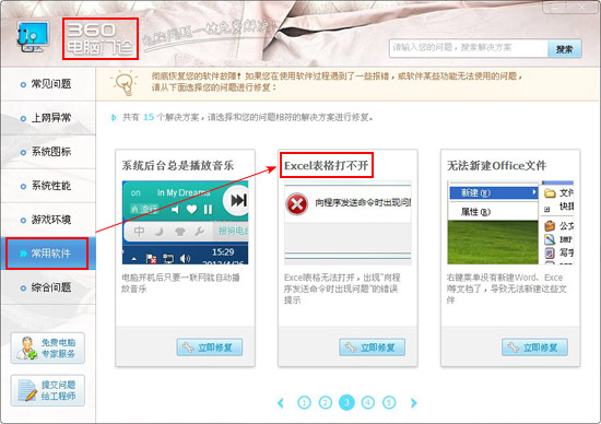 最后,經(jīng)過上面的步驟,如果還沒有解決問題,那么我們還可以打開360安全衛(wèi)士,在電腦門診里面,我們選擇常見軟件,然后就可以看見“Excel文件打不開”,我們打開按照解決就可以了。