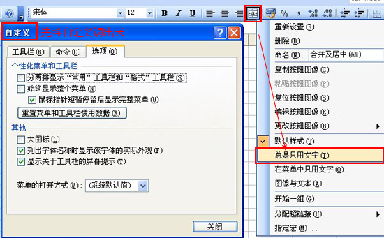 3、在我們選擇“自定義”之后,就會發現彈出一個窗口,但是這個窗口對我們來說,不需要做任何的點擊。然后我們找到工具欄,在居中并對其圖標上單擊鼠標右鍵,將會彈出下拉菜單,然后選擇“總是文字”,如圖所示: