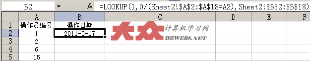 如下圖,在Sheet2中,我們存放兩列數據,A列為操作員的編號,B列為操作員的操作日期。