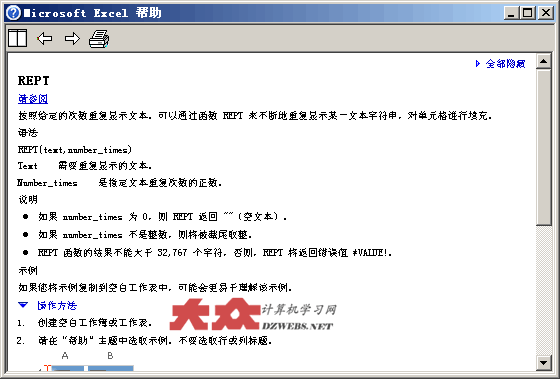 然后,下面會(huì)自動(dòng)出現(xiàn)背景顏色是黃顏色的區(qū)域,這個(gè)時(shí)候,使用鼠標(biāo)左鍵點(diǎn)擊函數(shù)名,如上圖紅線圈住的REPT函數(shù)名稱(chēng),這樣,就可以馬上打開(kāi)REPT函數(shù)的使用幫助了。如下圖。