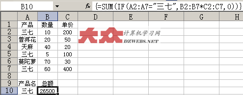 上述公式的含義是:在A2:A7這個(gè)區(qū)域中,只要有哪個(gè)的產(chǎn)品名稱等于“三七”,那么,該行的數(shù)量就乘以單價(jià),然后,再將各行的乘積相加起來,得到最終的結(jié)果。