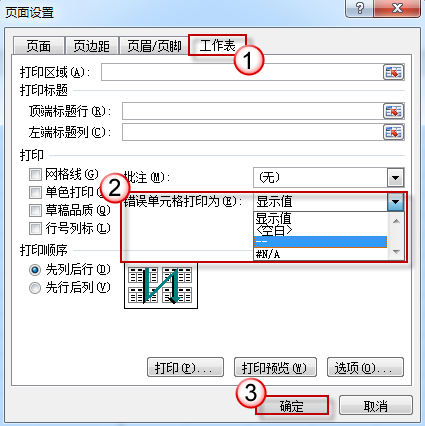 2、切換到“工作表 ”選項卡,從“錯誤單元格打印為 ”右側的下拉框中根據需要選擇“空白 ”或“-- ”。