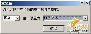 (2)時(shí)就會(huì)打開(kāi)“重復(fù)值”對(duì)話框,在這里你可以根據(jù)需要自行定義重復(fù)值單元格內(nèi)數(shù)據(jù)的顏色,如設(shè)置成醒目的紅色(如圖二),確認(rèn)后即可生效。