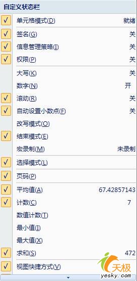 如圖四所示情況:把英語(yǔ)考試分?jǐn)?shù)全選,下面狀態(tài)欄顯示出平均值,計(jì)數(shù),求和。分?jǐn)?shù)情況一目了然,但是還是不夠詳細(xì),讓我們來(lái)設(shè)置一下。在下面的“狀態(tài)欄”點(diǎn)擊右鍵,彈出如(圖五)所示菜單
