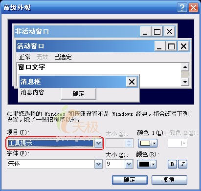 在“高級外觀”對話框中,在“項目”下方選擇“工具提示”,然后就可以設置提示內容的字體、字號、文本顏色、粗體斜體以及提示框的背景顏色等屬性了。