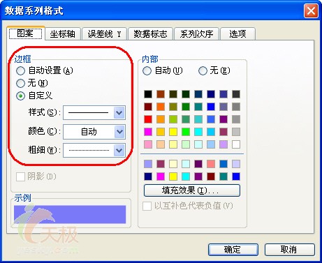 8.上面是制作了沒有邊框的半透明數據系列。如果希望再為柱形數據系列添加邊框,可以雙擊柱形數據系列,然后在“數據系列格式”對話框的“圖案”選項卡中重新設置邊框選項,如圖10所示。