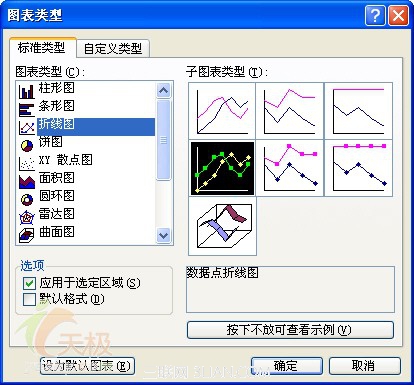 2.單擊第2個即2月的數據系列將其選中,然后選擇“圖形>圖形類型”,打開“圖形類型”對話框,選擇“折線圖”并單擊“確定”按鈕,如圖3所示。