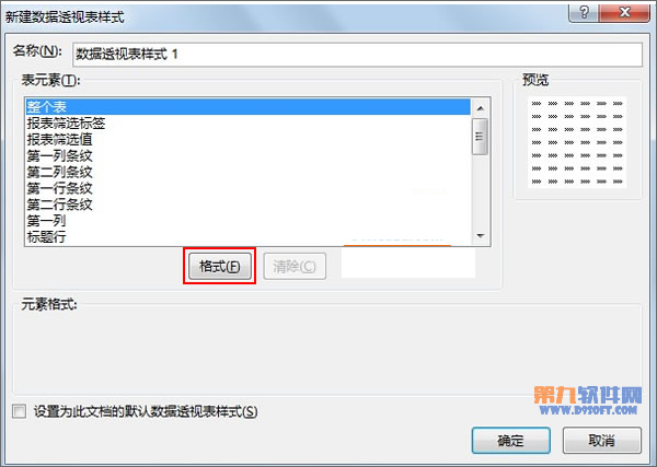 2、在新建表格樣式界面中,設置樣式名稱,選擇表元素,以整個表為例,單擊格式按鈕。