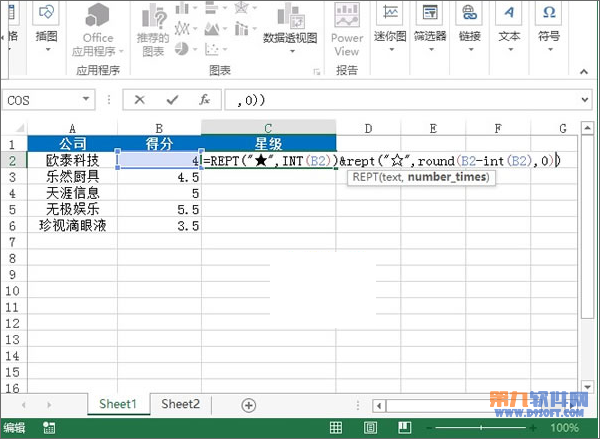 3、至此,發現公式有問題,這里用一個連接符&,將公式補齊:=REPT("★",INT(B2))&REPT("☆",ROUND(B2-INT(B2),0))