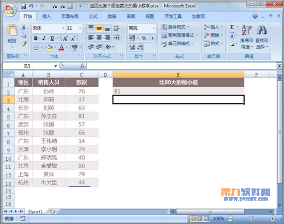 ①啟動Excel,小編是2007版本,打開先前我準備好了的源數據表格。A、B、C列分別為地區、銷售人員、數據,我們要算出數據中大于80的且最小的值。