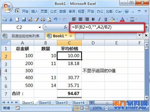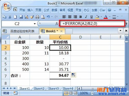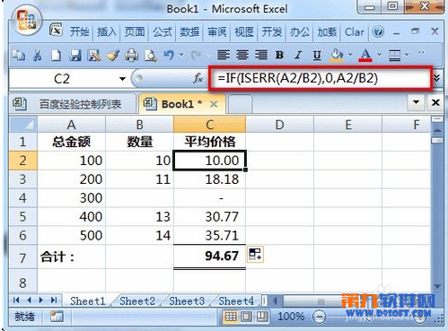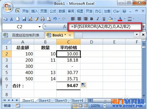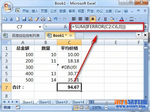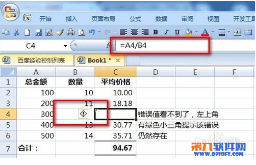 此時(shí),由于某些原因(假設(shè)這是合理的)B4單元格數(shù)量是0,因此C4的公式由于一個(gè)數(shù)值除以0產(chǎn)生了錯(cuò)誤值。由此導(dǎo)致在C7單元格求平均價(jià)格合計(jì)時(shí)也出現(xiàn)了錯(cuò)誤值。