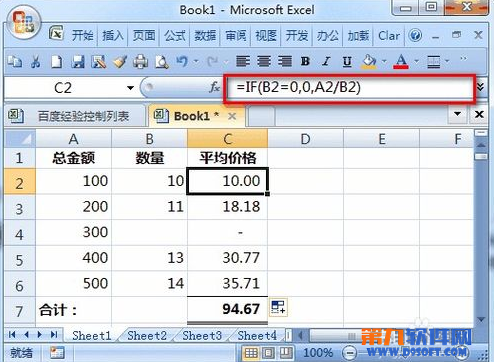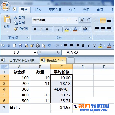 1、如下圖數(shù)據(jù),A列為總金額,B列為數(shù)量,在C2輸入公式=A2/B2求平均價(jià)格,在C7單元格求C列平均價(jià)格的合計(jì)數(shù)。