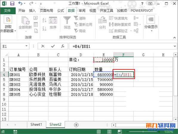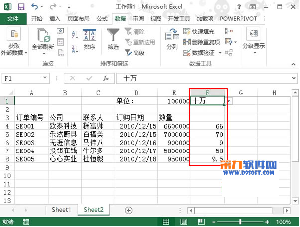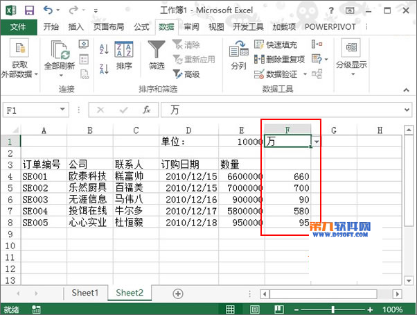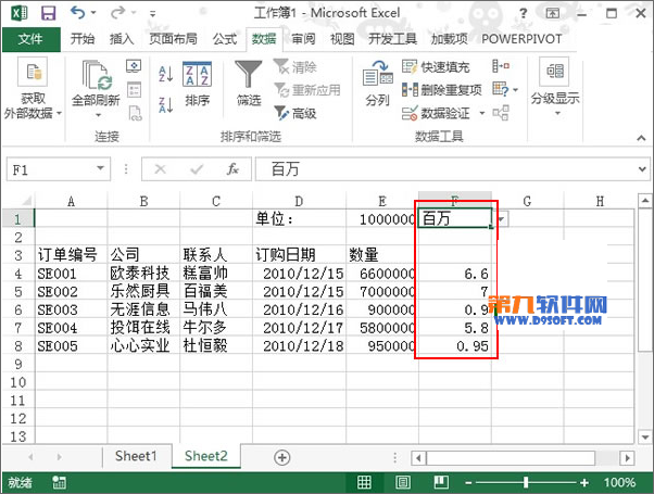6、此時在F1單元格單擊下拉箭頭,將單位改為十萬,下方F列數(shù)據(jù)發(fā)生變化,一看66,就知道結(jié)果是66十萬,即660萬。
