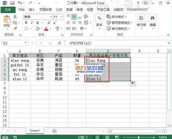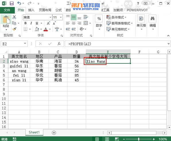 ①打開(kāi)Excel2013表格,數(shù)據(jù)如下圖所示,單擊E2單元格,輸入公式: =proper(A2)