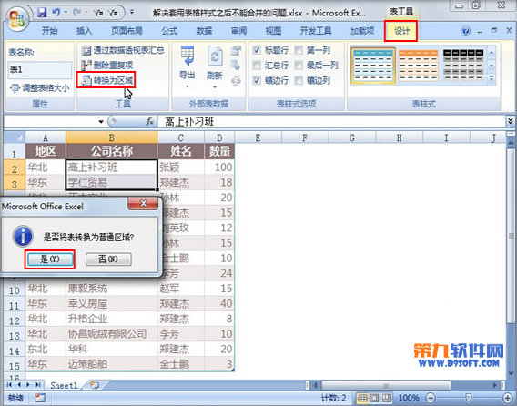 2、如何將其改為可用的呢?我們切換到設(shè)計(jì)選項(xiàng)卡,單擊轉(zhuǎn)換為區(qū)域選項(xiàng),彈出Microsoft Office Excel對(duì)話框,提示是否將表格轉(zhuǎn)換為區(qū)域,我們單擊是。