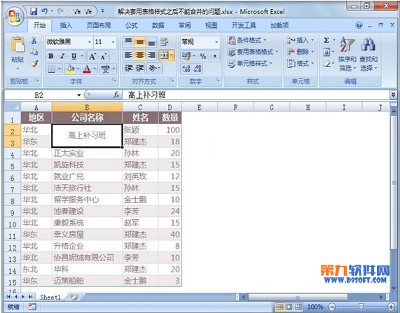 1、啟動(dòng)Excel2007,打開一份電子表格,當(dāng)我們選中B2:B3區(qū)域的時(shí)候,發(fā)現(xiàn)上面功能菜單中的合并居中按鈕為灰色,不可使用。