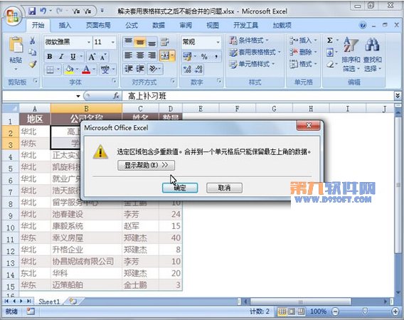 3、系統(tǒng)為了用戶考慮,再次提示選定區(qū)域包含多重?cái)?shù)值,合并到一個(gè)單元格后只能保留最左上角的數(shù)據(jù),單擊是。