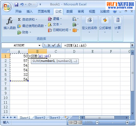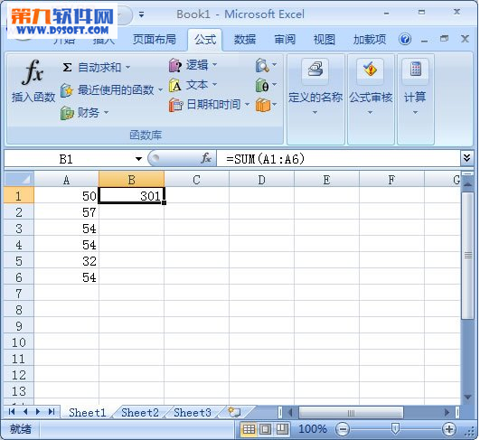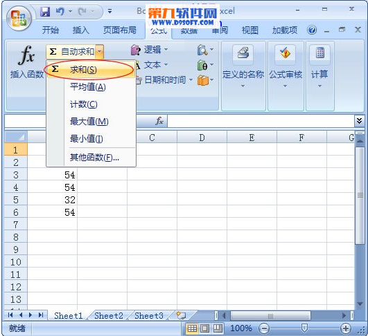①首先,將鼠標(biāo)選中需要存放結(jié)果的單元格中,然后單擊進(jìn)入Excel的“公式”選項(xiàng)卡,在“函數(shù)庫(kù)”選項(xiàng)組中單擊“自動(dòng)求和”旁邊的下拉按鈕,選擇“求和”;