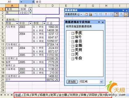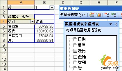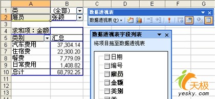 現在,不必更改原始工作表,您就可以創建另一個數據透視表,通過其他方式來查看數據;例如,可以按員工或按月份查看差旅費,而不必輸入一個公式。