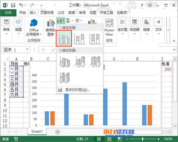3、單擊菜單欄--插入--圖表,選擇柱形圖中的簇狀柱形圖。