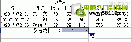 6)拖動填充手柄,把旁邊兩格也填充上,這樣就把各學科的及格人數統計好了;