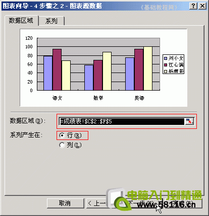 4)第二頁是數據區域,我們選中的是從“姓名-100”這一塊,每個學科一塊,直接點“下一步”按鈕,如果選“列”就是按姓名;