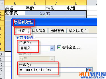 選取A2:D100,數(shù)據(jù)選項(xiàng)卡 - 有效性 - 允許 - 自定義,在來(lái)源框中輸入以下公式: