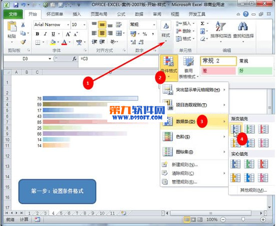 既然知道是條件格式,那當然就是在【開始】里找到【樣式】》【條件格式】了,然后選取【數據條】》【漸變填充】。