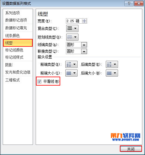 [3] 打開“設置數據系列格式”對話框,切換到“線型”面板,勾上“平滑線”選項,按“關閉”按鈕。