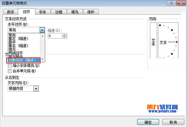 ③切換到對齊標簽,將水平對齊選為分散對齊(縮進)。