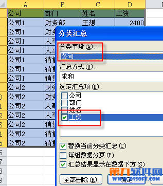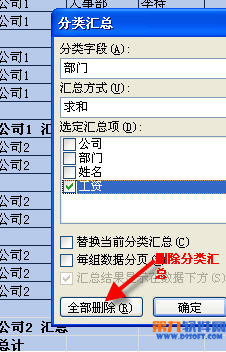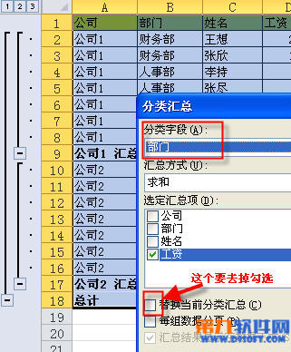 3、再次打開 數據 - 分類匯總,設置分類字段為“部門”并去掉“替換當前分類匯總”