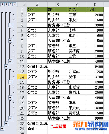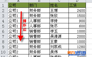 1、對源表按公司和部門進行排序。這是分類匯總的前提條件。排序后如下圖所示。