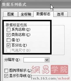 使用鼠標(biāo)右擊插入的餅圖,選擇“數(shù)據(jù)系列格式”命令(如圖3),在彈出的對(duì)話框中選擇“數(shù)據(jù)標(biāo)志”標(biāo)簽(如圖4),然后選中其中的“類別名稱”、“百分比”選項(xiàng),單擊“確定”按鈕,這樣在餅圖的每個(gè)組成部分就會(huì)顯示其所占比例以及項(xiàng)目名稱了,如耗鹽13%,而且當(dāng)指向餅圖中的某個(gè)部分,就會(huì)顯示其具體數(shù)值,從而能夠更加準(zhǔn)確地判斷其比例構(gòu)成了。