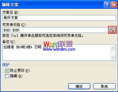 ④在彈出的“編輯方案”頁面框中的“方案名”里填入你想設置的方案名字,這里輸入“最好方案”舉例,然后在“可變單元格”文本框中通過右邊的“拾取器”按鈕選擇可變單元格區域,這里選擇的是D2:D5區域,最后按“確定”按鈕。