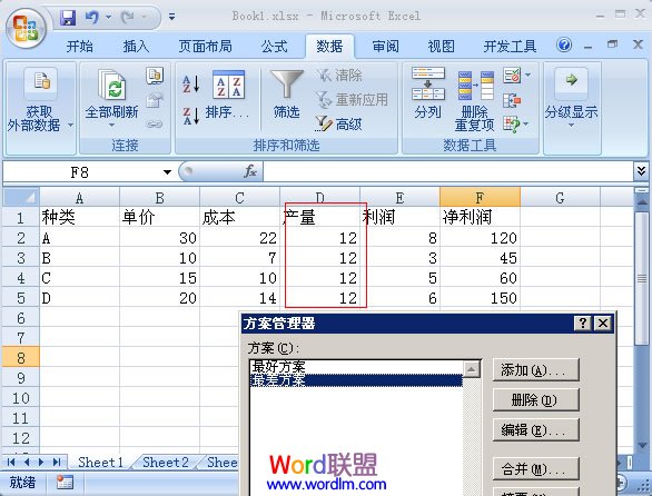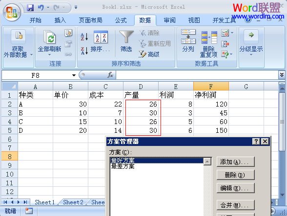 ?、嵊脩舸蜷_“方案管理器”,在鼠標雙擊“最好方案”時,D2:D5區域的數值就變成了你之前設置的最好方案數值,如圖所示。