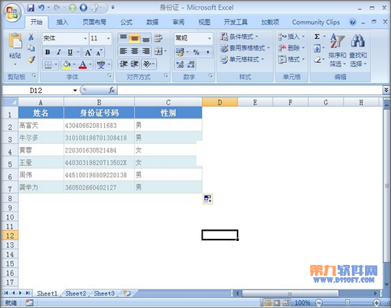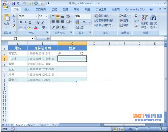 ①我們啟動Excel,在單元格中輸入姓名,身份證號碼,以及性別,我們要根據(jù)身份證號碼求得其性別,在性別列中輸入下面的公式,稍后有公式說明,便于大家理解。