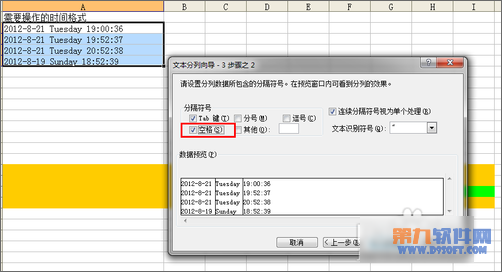 4、然后我們將空格勾選,當然,這里要根據數據格式,如果是分號分隔的,那可以勾選分號,勾選完成以后,在數據預覽的區域里,就會顯示按照要求分隔后的格式,然后點擊下一步: