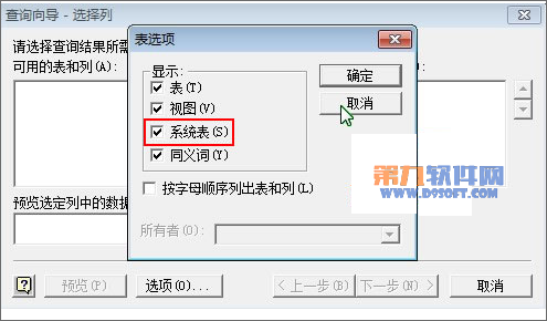 4、查詢向導界面中,先點擊選項按鈕,從彈出的表選項界面中勾選系統表,確定。