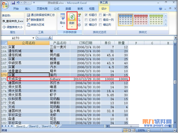 9、返回到最開始的那張表,單擊菜單欄--設計--刷新,看到171行立即顯示出了我們上一步插入的數據,結果表明是支持即時更新的。