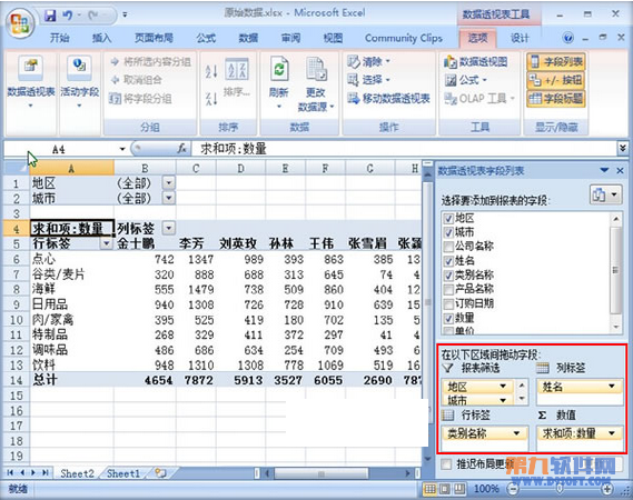 ②右側出現數據透視表字段列表,將地區和城市拖到報表篩選中,姓名拖到列標簽中,類別名稱拖到行標簽中,求和項拖到數值中。